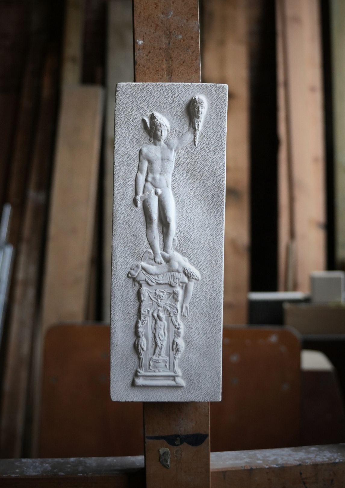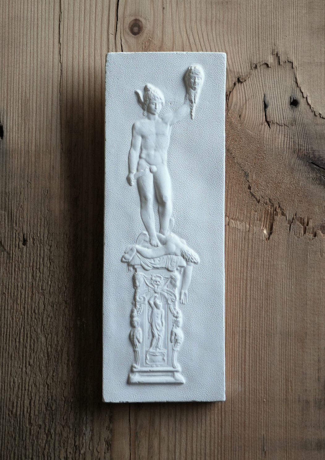 Handmade plaster relief created by Nicholas H Wood. This cast reproduces Perseus with the Head of Medusa, the celebrated bronze by Benvenuto Cellini, originally installed in the Loggia dei Lanzi in Florence. The relief captures the triumphant moment after Perseus’ victory, standing poised over Medusa’s fallen body while raising her severed head aloft.